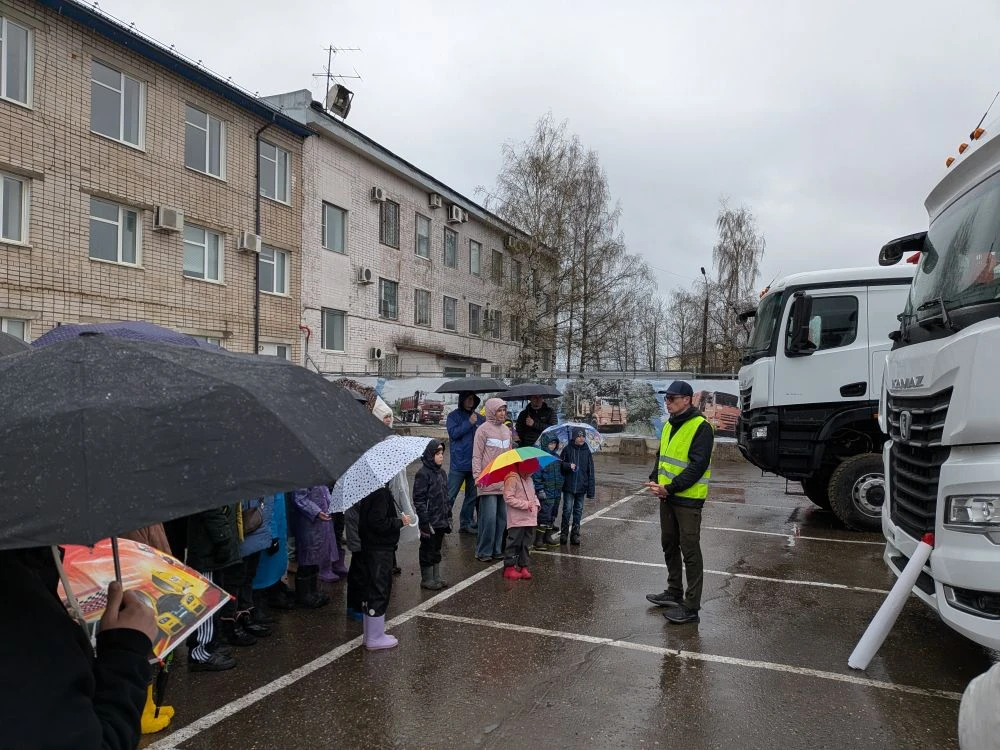 26 апреля мероприятие прошло успешно, несмотря на дождь. Дети с интересом изучали новые КамАЗы К5. Это был проект «Папина работа» от Союза отцов Вологодской области, который знакомил детей с профессиями их отцов.